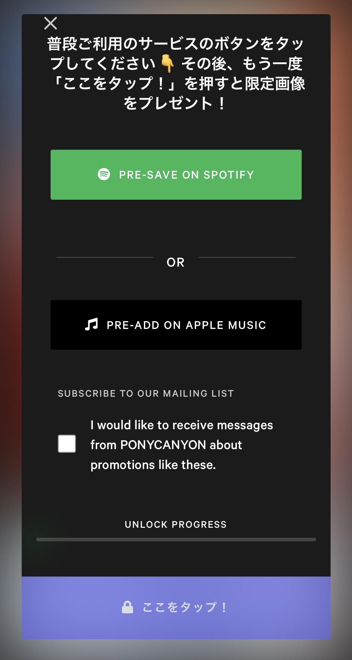 ➁アカウント連携後、再度【ここをタップ!】を押すと、Spotify又はApple Musicにご登録されているメールアドレス宛てに特典が届きます!