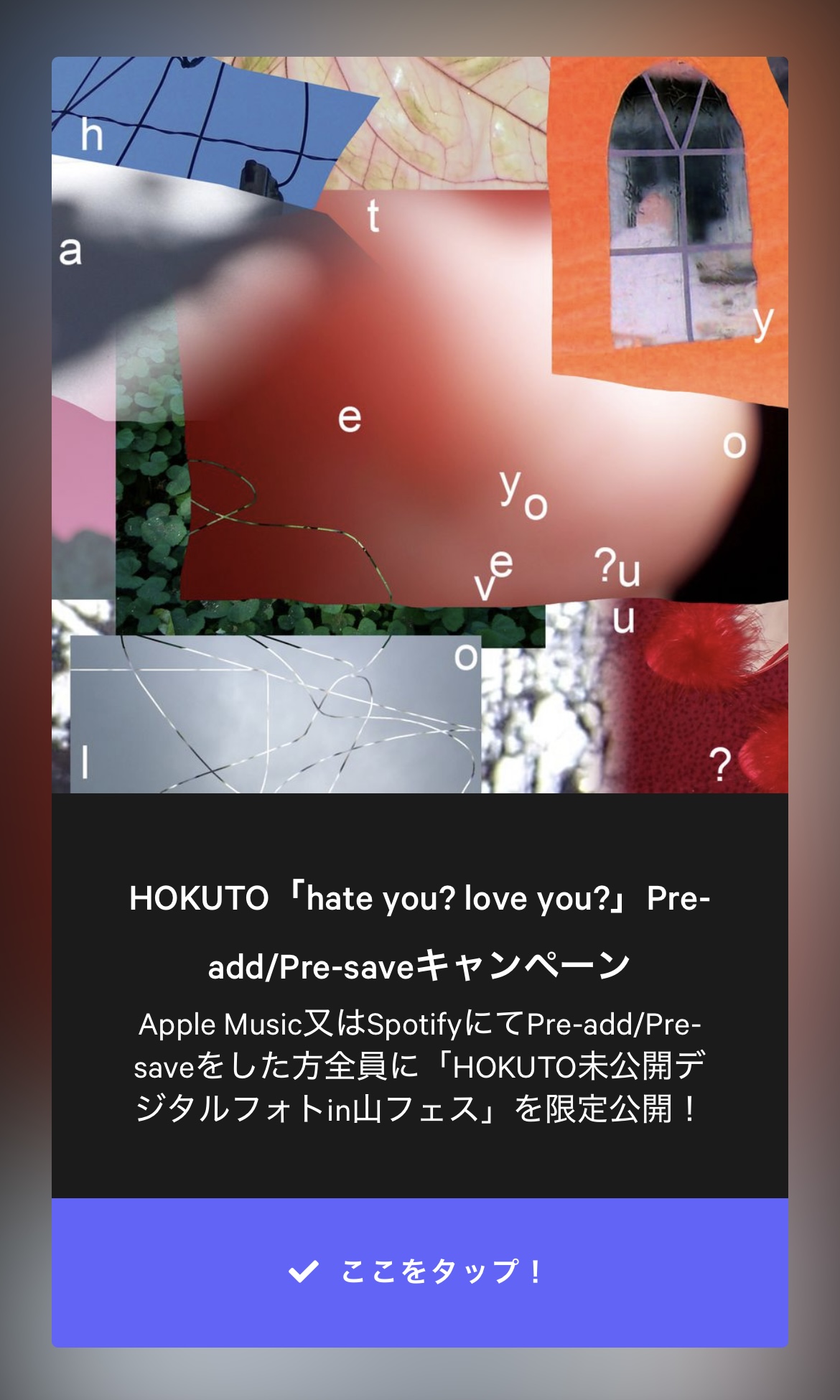 3月6日(金) 配信開始のHOKUTO「hate you? love you?」のリリースを記念して、Apple Music/Spotifyを対象に、Pre-add/Pre-saveキャンペーンを開催いたします。実施期間中にPre-add/Pre-saveをした方全員へ「HOKUTO未公開デジタルフォト in 山フェス」をプレゼント!